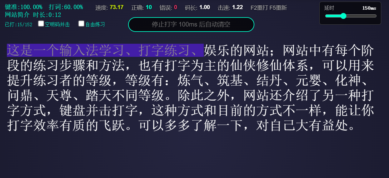 在线就能打字练习,有速度,有打词率,有码长,击键速度,准确率和键准等各项关键指标;让文字工作者短时间能提升录入速度,提高工作工作。